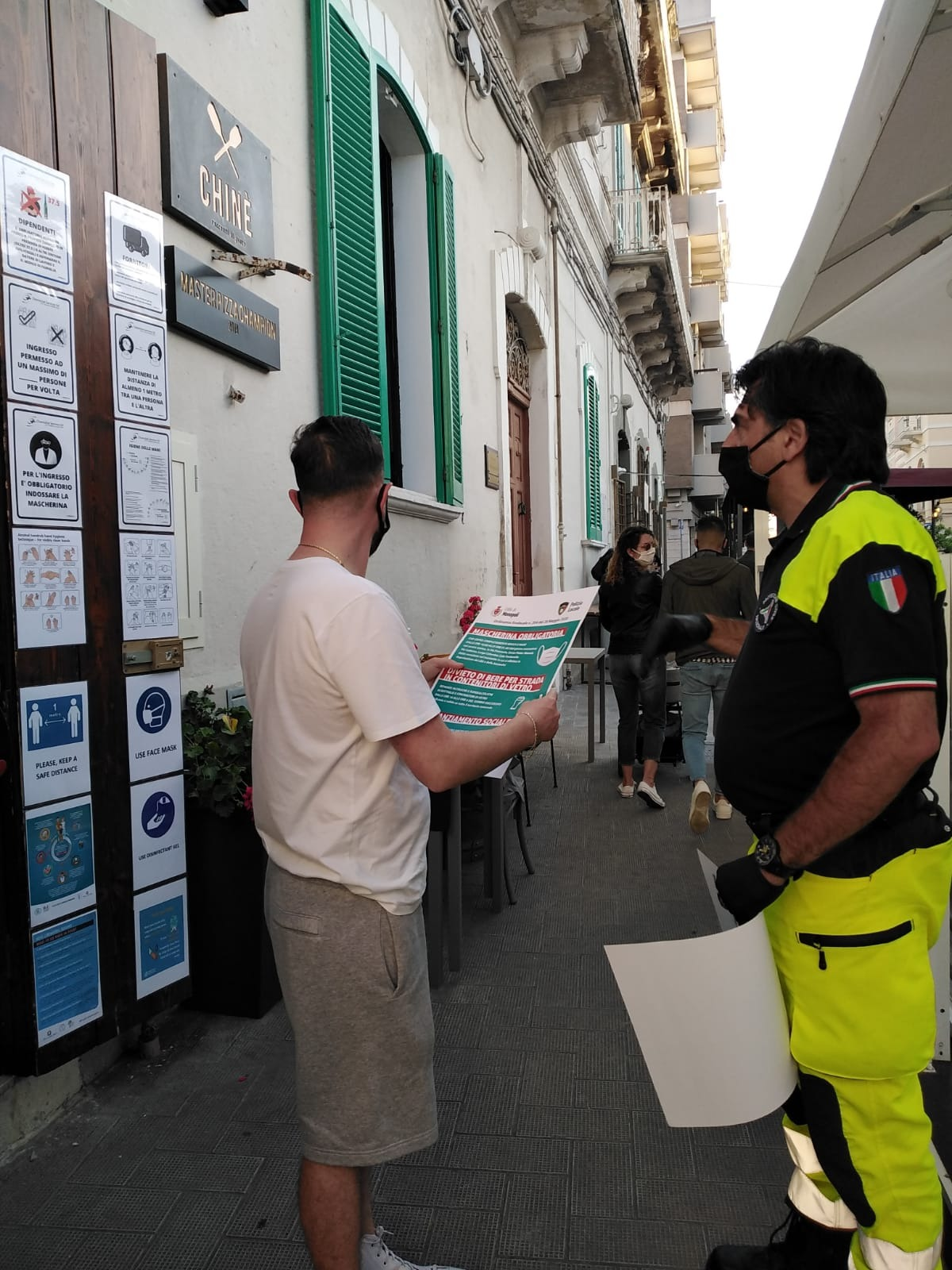 La Protezione Civile non si è limitata alla sola informazione, provvedendo vieppù anche a distribuire le mascherine ai pochi cittadini che ne erano sprovvisti; infatti, così come recita l’ordinanza di Annese, è vietato frequentare i luoghi della movida, dalle 18.00 all’una di notte, senza indossare il necessario, dpi che deve coprire completamente le vie aeree (naso e bocca).