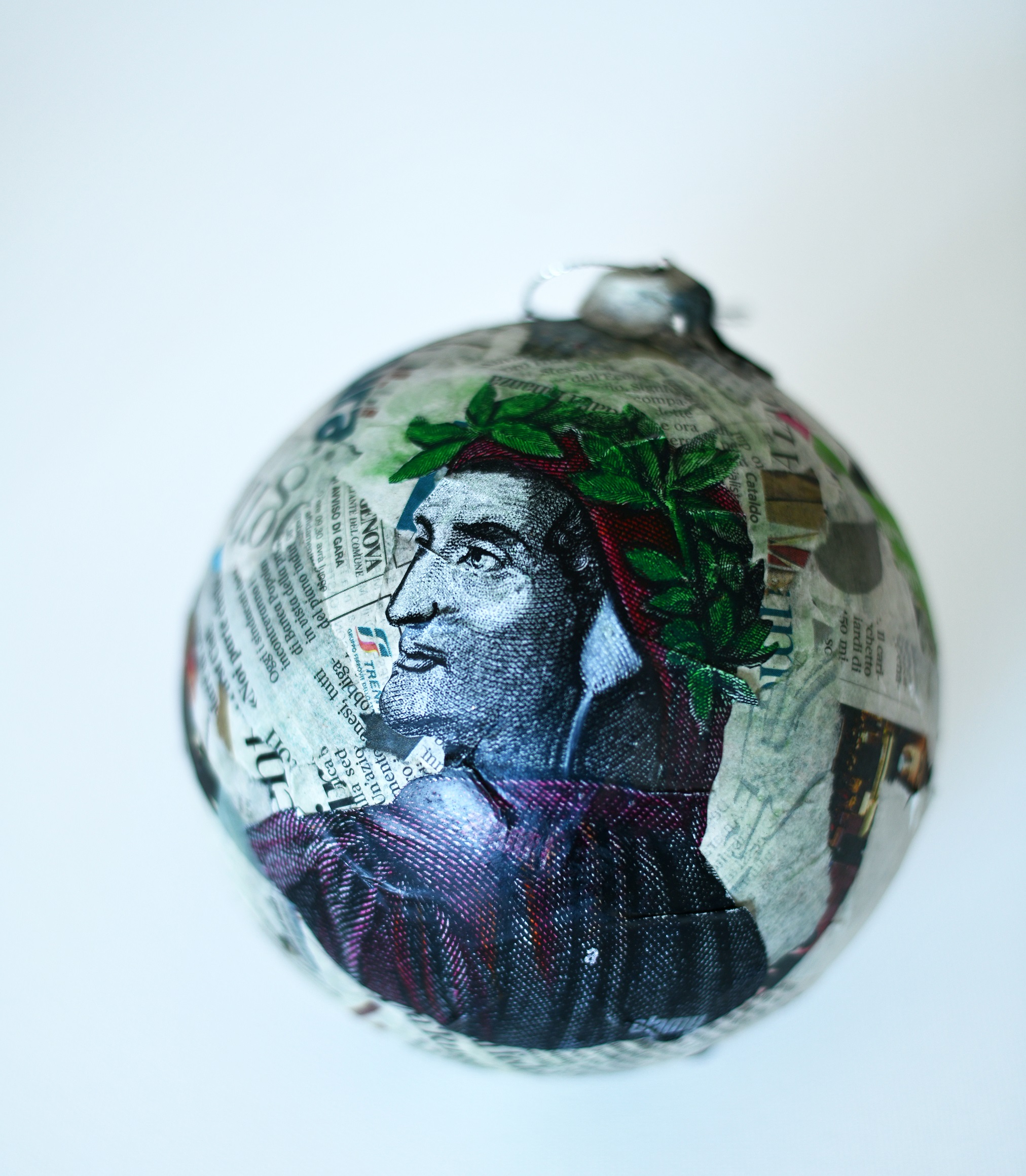 Le prof.sse Nunzia Pesce e Caterina Pepe utilizzano carta di giornale riciclata per la realizzazione di sfere, una scelta economica ed ecologica con lo scopo di ridurre l’inquinamento e prevenire il taglio di nuovi alberi. Le sfere vengono realizzate con la tecnica della cartapesta a strati e colla vinilica sulle quali sono sovrapposte le immagini delle opere di artisti famosi come Klimt e Van Gogh e i volti di personaggi illustri quali Dante, Manzoni, Platone, Beethoven, Newton.