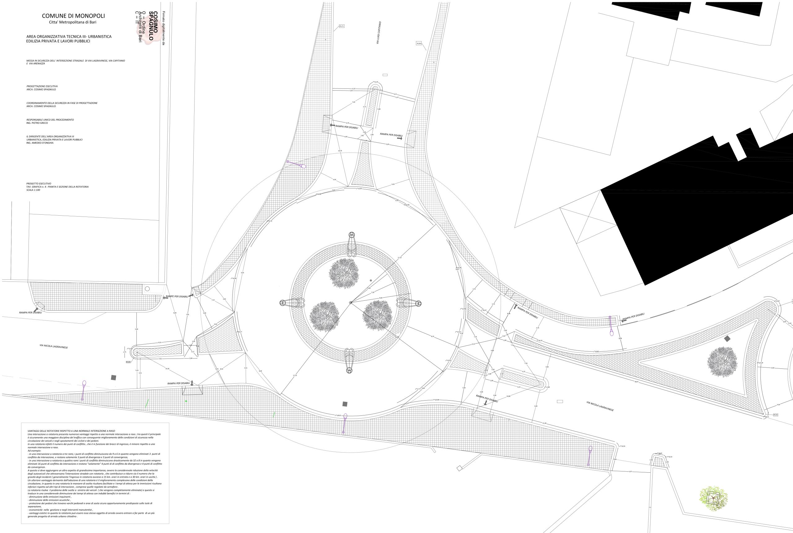 L’opera rientra nel programma di interventi finalizzati alla messa in sicurezza e alla regolazione dei flussi di traffico automobilistico e ciclopedonale di alcune intersezioni stradali particolarmente importanti per la mobilità, mediante la costruzione di alcune rotatorie, il recupero funzionale della planarità stradale e la periodica manutenzione della segnaletica stradale. In particolare, il progetto deriva dalla necessità di mettere in sicurezza, regolare i flussi di traffico e limitare la velocità degli autoveicoli che attraversano l’intersezione stradale tra le tre vie, nonché di velocizzare e rendere maggiormente sicure le immissioni e le svolte degli autoveicoli soprattutto nelle ore di punta del traffico cittadino. Al contempo si prevedono interventi per una maggiore sicurezza dei pedoni e accessibilità per le persone diversamente abili.
