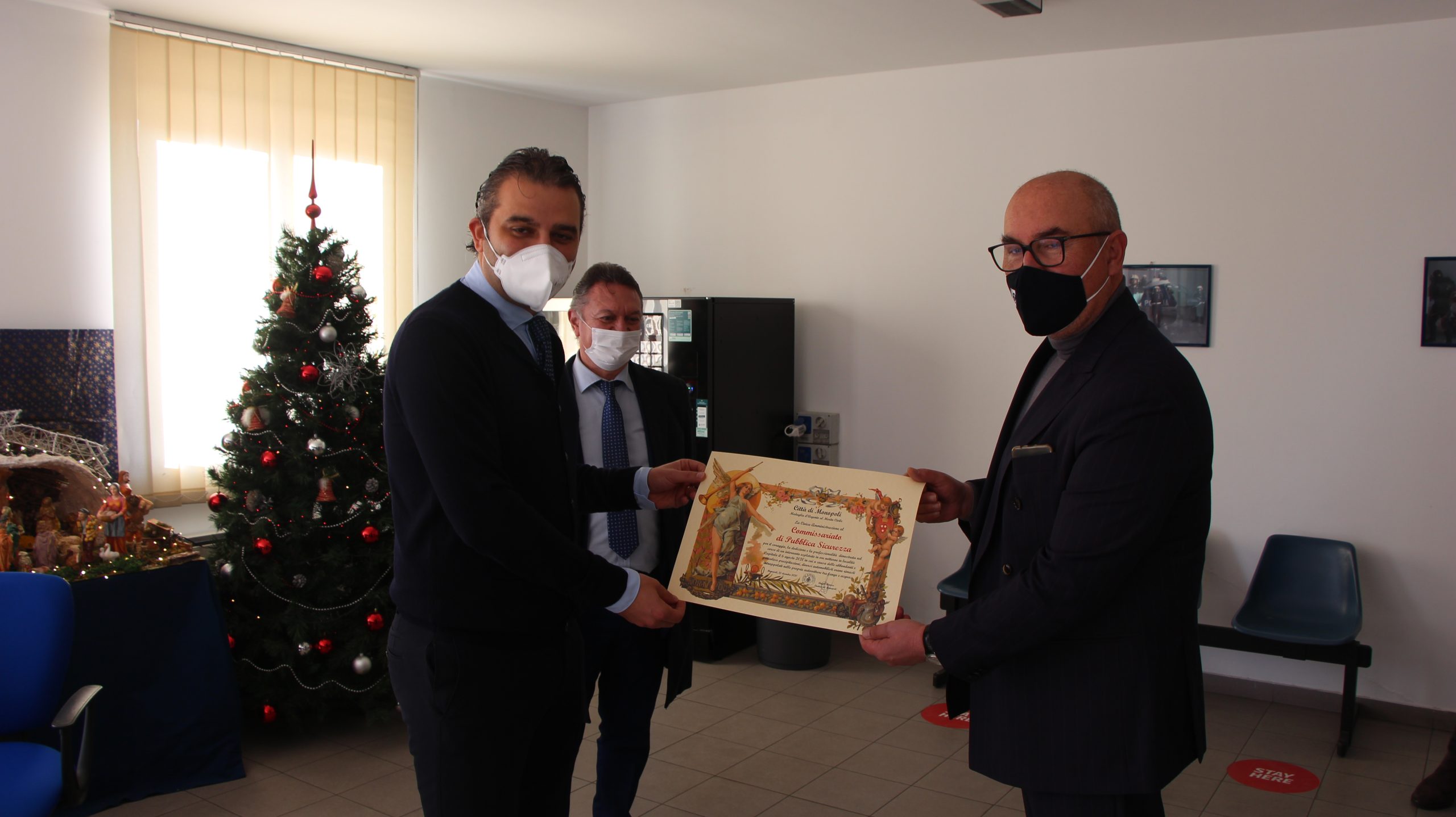 Il ringraziamento del Sindaco si è poi ulteriormente realizzato con la consegna di una pergamena al Commissariato di P.S. a riconoscimento “del coraggio, della dedizione e la professionalità dimostrata nel caso si un intervento espletato in ore notturne in località Capitolo il 6.8.2020 in cui a causa delle abbondanti e pericolose precipitazioni, diversi automobilisti erano rimasti intrappolati nelle proprie autovetture tra fango e acqua”.