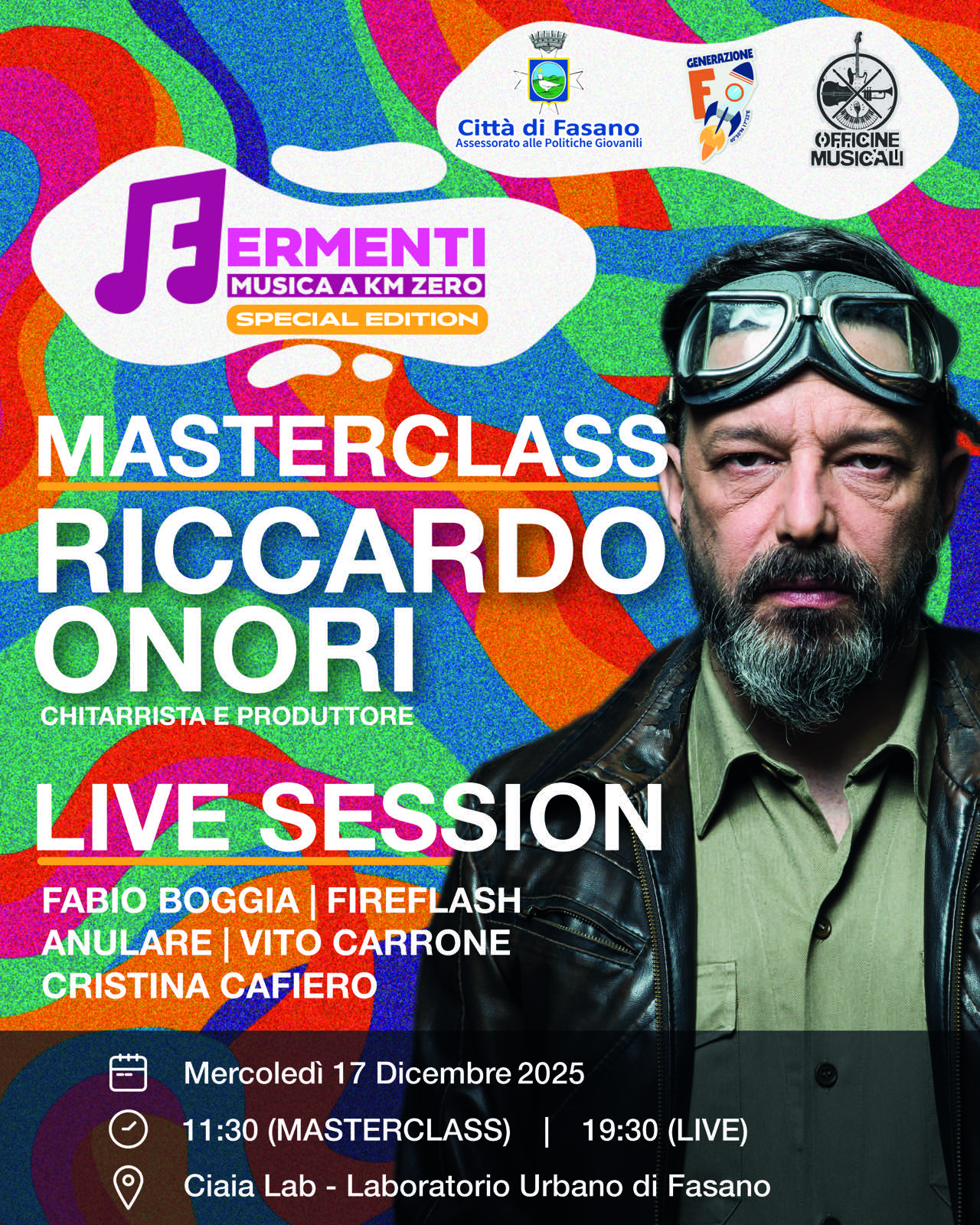 Ospite d’onore dell’edizione 2025 sarà Riccardo Onori, chitarrista, compositore e produttore tra i più apprezzati del panorama italiano. Storico chitarrista di Jovanotti, Onori vanta collaborazioni con artisti del calibro di Robbie Williams, Enrico Rava e Stefano Bollani. A Fasano metterà la sua esperienza al servizio dei giovani partecipanti attraverso un workshop intensivo, sessioni di prove condivise e una performance live finale aperta al pubblico.