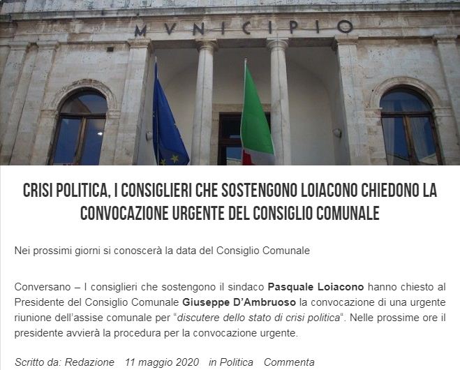 Crisi e fake news. Sabato 9 i consiglieri di opposizione, come puntualmente riportato da SudEst Online, hanno protocollato l’urgente invito al sindaco Loiacono a conferire in consiglio comunale sulla crisi e sui problemi che hanno attanagliato la sua maggioranza, portandola oggi ad un passo dall’arrivo del commissario. Lunedì 11 maggio, cioè ieri, i consiglieri che sostengono Loiacono hanno risposto presentando a loro volta la stessa richiesta. Così il blog di Rotunno dà la notizia: “I consiglieri che sostengono Loiacono chiedono la convocazione urgente del consiglio comunale”. Una fake news sia perchè non dà la notizia vera (“l’opposizione ha chiesto la convocazione e la coalizione di Loiacono ha condiviso e a sua volta l’ha proposta”) sia perchè tende a mettere in cattiva luce l’altra parte politica. Questo non è giornalismo. E’ propaganda spacciata per giornalismo. Solo qualche giorno fa Rotunno si era fatto intervistare dal suo stesso blog.
