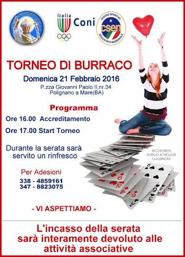 Svago e promozione sportiva Domenica 21 Febbraio p.v. presso il civico nr.34 di Piazza Giovanni Paolo II di Polignano a Mare. L’Associazione Giovanni Paolo II organizza un torneo di Burraco e le quote dei giocatori, saranno utilizzate per finanziare le numerose attività dell’associazione in programma nel 2016. L’inizio del torneo è previsto per le 17.00 con accreditamento a partire dalle ore 16.00. Saranno premiate le prime tre coppie classificate. “Oramai – dicono i promotori – è fondamentale reperire fondi privati in quanto quelli pubblici sono sempre meno, uniamo alla passione del gioco la gioia di trascorrere una serata in allegria e di fare un’opera di beneficenza“.