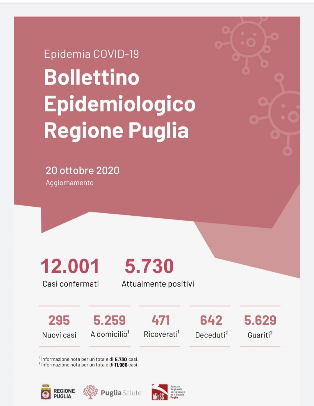 Il totale dei casi positivi Covid in Puglia è di 12.001 così suddivisi: