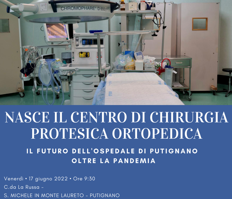 Il nuovo modello organizzativo di Chirurgia Protesica Ortopedica: l’Ospedale di Putignano proiettato verso il futuro. Sarà questo il tema della conferenza organizzata dalla ASL Bari per il 17 giugno 2022, alle ore 9,30 nell’auditorium della struttura sanitaria di San Michele in Monte Laureto (Contrada La Russa – Putignano), durante la quale sarà illustrato il nuovo Centro di Chirurgia ortopedica protesica, attivo già dal 1° giugno scorso e destinato ad essere polo di riferimento nel territorio del Sud Est barese.