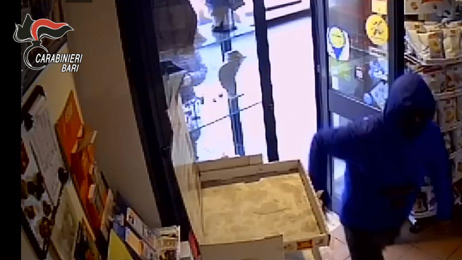 I militari della Stazione CC di Grumo Appula sono immediatamente intervenuti sul posto acquisendo il video che ritraeva il rapinatore nel momento in cui si avvicinava al negozio, quindi il suo fulmineo ingresso con il lancio di una pietra all’indirizzo della vittima, la sottrazione del denaro contante e dei biglietti gratta e vinci, nonché la fuga con il tentativo di colpire nuovamente il titolare della tabaccheria.