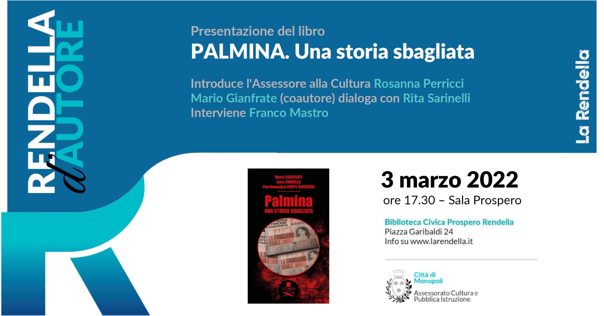 Giovedì 3 marzo alle ore 17.30 presso la Sala Prospero della Biblioteca Rendella sarà presentato il libro di Mario Gianfrate, Sara Cordella e Pierdomenico Corte-Ruggiero dal titolo Palmina. Una storia sbagliata.