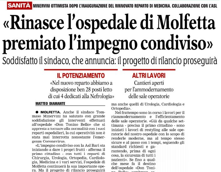“Rinasce l’Ospedale di Molfetta, premiato l’impegno condiviso”. Esulta il sindaco di Molfetta Tommaso Minervini. Non può fare parimenti quello di Conversano, Pasquale Loiacono perchè è nota a tutti la vicenda della mancata risposta del presidente della Regione Puglia Michele Emiliano e dello stesso primo cittadino, alla proposta di fattibilità di 30 nuovi posti letto di subintensiva e post acuzie Covid con riapertura del Pronto soccorso, presentata dai medici capitanati dal neurologo dottor Luigi Giampietro. A questa si è aggiuntlo l’appello dell’ex sindaco della città avvocato Francesco Iudice che con una lettera aperta chiede a Emiliano di non consentire la chiusura di Pneumologia allo Jaja, in un momento difficile come quello che attraversiamo. La chiusura – dice Iudice – scatterebbe il 1° giugno col pensionamento del responsabile dottor Giuseppe Castellana che resterebbe ancora oggi senza successore. La storia recente insegna che al Florenzo Jaja sono stati chiusi reparti ed ospedale proprio a causa della mancata sostituzione dei primari e dei dirigenti medici. (FOTO articolo pubblicato sui giornali di oggi)