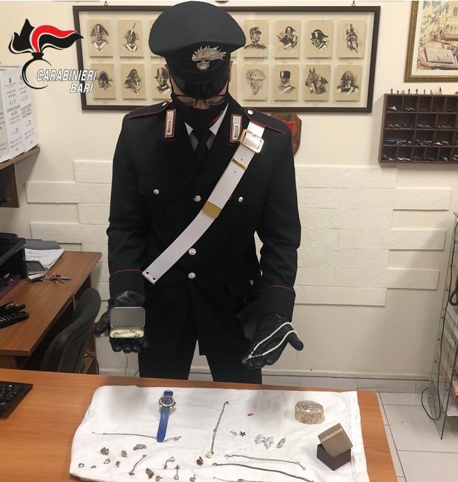 Mentre il soggetto veniva accompagnato in caserma e tratto in arresto per resistenza a pubblico ufficiale, le immediate indagini consentivano di appurare che la federa ed i monili in oro erano provento di un furto in abitazione consumato, qualche ora prima, in Palo del Colle, ai danni di una 80enne del luogo, a cui è poi stata restituita la refurtiva. Pertanto per il 19enne è scattata anche la denuncia per ricettazione.