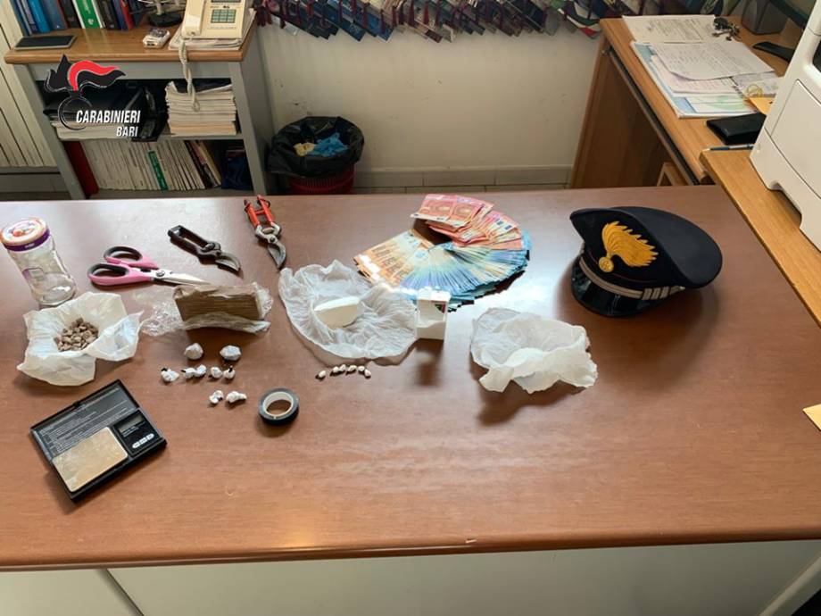 Quanto rinvenuto è stato sottoposto a sequestro e la droga nei prossimi giorni sarà analizzata dal Laboratorio del Comando Provinciale Carabinieri di Bari.