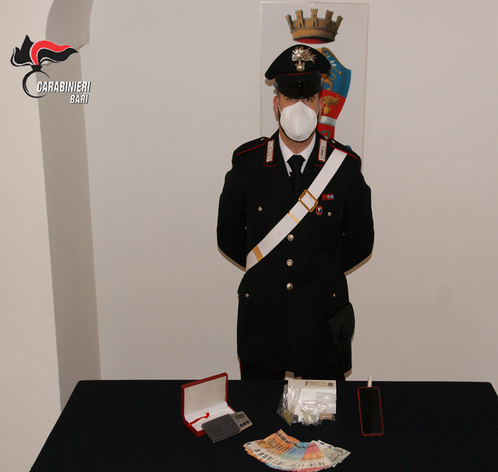 I Carabinieri hanno esteso la perquisizione anche presso l’abitazione del 20enne dove, oltre al materiale per il confezionamento dello stupefacente, è stata rinvenuta un’ulteriore dose di marijuana e un bilancino di precisione. Durante l’operazione è stata sottoposta a sequestro anche la somma di euro 930,00 ritenuta provento dell’illecita attività si spaccio. La droga nei prossimi giorni sarà analizzata dal Laboratorio del Comando Provinciale Carabinieri di Bari, mentre il giovane è stato sottoposto agli arresti domiciliari, ove rimarrà a disposizione dell’Autorità Giudiziaria.