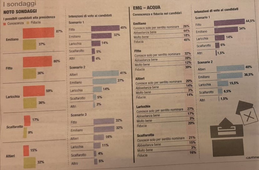 Elezioni regionali. fioccano i sondaggi e in Puglia, due autorevoli società, la IPR NOTO e EMG ACQUA confermano univocamente la tendenza che dà il centrodestra avanti, con Raffaele Fitto (FdI) che sopravanza nelle intenzioni di voto il governatore Michele Emiliano (indipendente) del 12% mentre Antonella Laricchia (M5S) è al 15%.