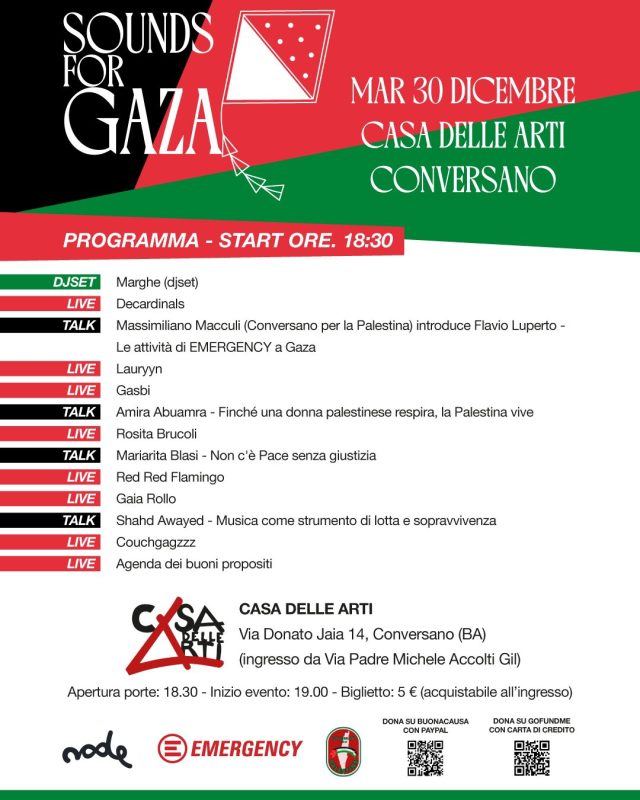 Dopo l’evento del 16 novembre al Teatro Kismet di Bari, fa tappa a Conversano il secondo appuntamento della campagna solidale Sounds for Gaza. L’evento di musica dal vivo, talk e testimonianze per sostenere Emergency a Gaza si svolgerà martedì 30 dicembre alla Casa delle Arti a partire dalle ore 18:30 con un biglietto di 5 euro, acquistabile al botteghino. L’iniziativa rientra nel progetto promosso dall’ Associazione culturale Node insieme a una rete ampia e trasversale di artisti, operatori culturali, associazioni, esercenti e cittadine e cittadini, nato con l’obiettivo di trasformare l’arte e la musica in un atto concreto di solidarietà a sostegno della popolazione civile palestinese. L’evento di Conversano, pensato come un momento di incontro, musica e partecipazione collettiva durante il periodo delle festività natalizie, rappresenta un grande momento pubblico a metà del cammino che porterà alla chiusura della campagna, prevista per il 31 gennaio, quindi un’occasione per rilanciare e rafforzare l’obiettivo finale. L’appuntamento è concepito infatti come un party solidale, in cui musica dal vivo, dj set e momenti di approfondimento si intrecciano in un flusso continuo. Una serata che mantiene lo spirito di Sounds for Gaza: accessibile, partecipata, capace di unire intrattenimento e riflessione. Sul palco si alterneranno artiste e artisti della scena musicale indipendente, accompagnati da interventi e talk che daranno voce a prospettive diverse: dal racconto dell’impegno umanitario sul campo alle riflessioni su pace, giustizia, diritti e resistenza culturale. Tra i momenti centrali della serata, gli interventi di Flavio Luperto, Massimiliano Macculli, Amira Abuamra, Mariarita Blasi e Shahd Awayed, che offriranno chiavi di lettura profonde e complementari sulla condizione palestinese, sul ruolo delle donne, sulla cultura come strumento di sopravvivenza e di lotta. La serata sarà aperta e accompagnata dal dj set di Marghe, con una successione di esibizioni live che restituiranno il senso collettivo e conviviale dell’iniziativa. Sul palco (in ordine alfabetico): Couchgagzzz, Decardinals, Gaia Rollo, Gasbi, Lauryyn, Red Red Flamingo, Rosita Brucoli.