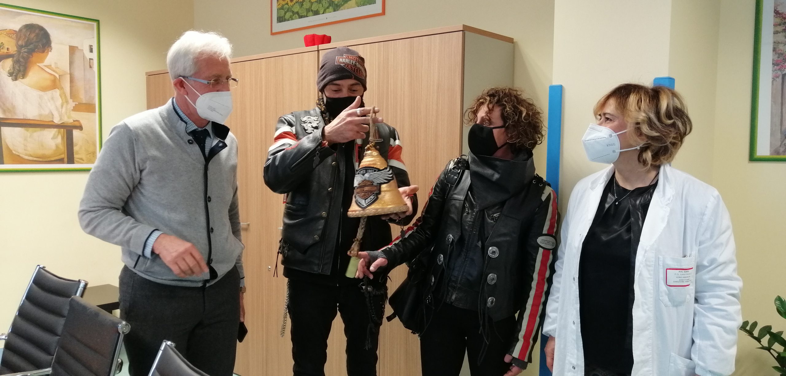 I rintocchi di campana, nell’Oncologia dell’Ospedale San Paolo, segneranno d’ora in poi un lieto evento: la fine del percorso terapeutico. Il dono di un paziente, consegnato stamane nelle mani del direttore di Oncologia Nicola Marzano e del direttore medico del presidio Angela Leaci, assume – afferma il dottor Marzano – «una ricca valenza simbolica soprattutto perché arriva da chi come Roberto Befo, 47 anni, è da qualche mese alle prese con la sua personale battaglia contro la malattia che però non affronta da solo ma con la condivisione di un reparto che si fa carico del suo attuale vissuto». «E’ il nostro regalo di matrimonio – ha detto Roberto assieme a sua moglie – e dentro c’è tutta la nostra passione per le moto, ma anche l’augurio per tutte le persone che devono affrontare una difficile sfida e il sostegno al personale che, in questo reparto, ci offre le cure più appropriate e una grande umanità».
