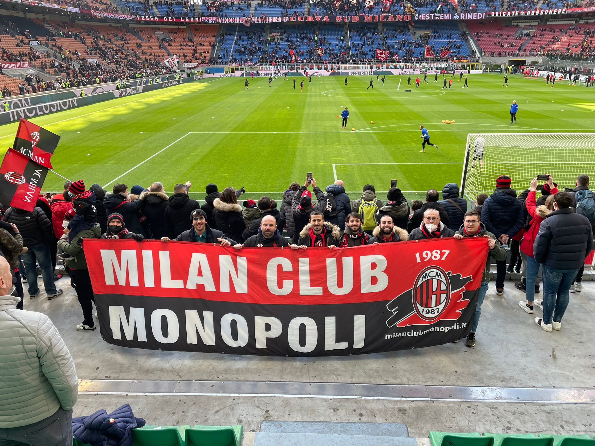 Il Milan Club Monopoli domenica 13 febbraio scorso ha organizzato un’altra trasferta per i soci e appassionati dei colori rossoneri per Milan-Sampdoria, partita valida per la 25sima giornata di campionato. Un appuntamento molto sentito dai tifosi rossoneri monopolitani e non solo per poter tornare al vertice del campionato con l’eventuale vittoria. La trasferta allo stadio San Siro, che ha visto il Milan vincere 1-0 con goal di Leao all’8° minuto del primo tempo, è stata organizzata in aereo con partenza prevista all’alba del 13 febbraio dall’aeroporto Bari Palese e rientro in serata da Milano Linate. Alla trasferta hanno aderito venti partecipanti tra soci del Milan Club e appassionati dei colori rossoneri. La trasferta si è svolta in un clima sereno, con una bellissima giornata di sole milanese corredata dalla sentita vittoria ottenuta nell’anticipo di campionato. Il Milan Club Monopoli ha partecipato alla giornata con un proprio striscione nel primo anello verde dello stadio ben evidenziato anche dalle televisioni nazionali. Una giornata nel complesso positiva e gioiosa per tutti i nostri soci e tifosi al seguito che ha segnato il sorpasso all’Inter e il primato momentaneo in vetta alla classifica. “È stata una bellissima trasferta – ha dichiarato Giovanni Greco, Presidente del Milan Club Monopoli – organizzata e vissuta tutta in un’unica giornata. Le aspettative per la partita erano alte – ha proseguito Greco – vista la possibilità di poter superare l’Inter e riprenderci il primato in classifica. E con la vittoria raggiunta così è stato. Siamo tornati capolisti, anche se momentaneamente. I soci e tutti noi siamo molto felici della giornata trascorsa e del risultato ottenuto. A coronamento della giornata – ha concluso Giovanni Greco – c’è stato un inaspettato regalo. Durante il riscaldamento pre partita, a pochi minuti dal match, un giocatore del nostro Milan come Messias, durante il palleggio, ha lanciato per sbaglio un pallone nel nostro settore, sul primo anello verde, che è poi arrivato, con un pizzico di fortuna e un compromesso con un tifoso del posto, al sottoscritto. Lo conserveremo al nostro club come simbolo della bella giornata vissuta e soprattutto del ritorno al vertice della classifica”.