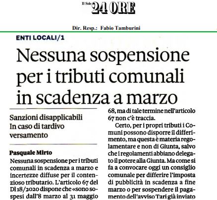 Una beffa. Il Sole 24 Ore di oggi fa chiarezza sul decreto legislativo 18/2020 articolo 67 e lancia un sos, nella speranza che il governo Conte nell’atto di promulgazione della legge sospenda davvero i tributi comunali in scadenza a marzo.