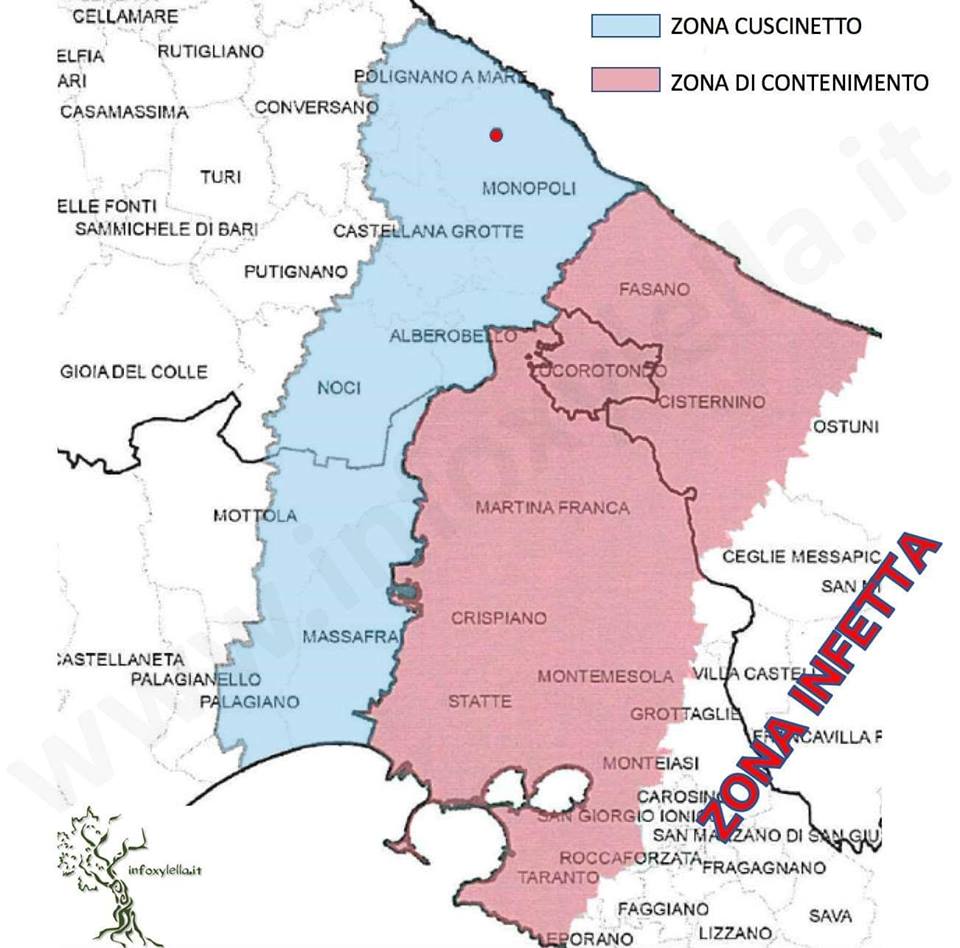 L’Osservatorio fitosanitario della Regione Puglia ha informato, nelle scorse ore, i sindaci dei comuni del Sud Est Barese dell’inserimento delle aree comunali nella nuova zona cuscinetto. «La nuova zona – comunica l’ingegnere Giuseppe Tedeschi, dirigente del Dipartimento agricoltura e sviluppo rurale della Regione Puglia – che già comprendeva l’intero territorio comunale di Massafra e parte del comune di Mottola nel tarantino, insieme ad Alberobello e parte dei comuni di Monopoli, Palagiano, Castellana Grotte, Putignano e Noci, è stata ora estesa alla restante parte del comune di Monopoli ed a parte degli agri di Polignano a Mare e Conversano». L’ampliamento della zona attenzionata è scattato a seguito dell’individuazione del focolaio in contrada Caramanna a Monopoli. La zona cuscinetto posta a nord è stata quindi estesa con un raggio di 10 chilometri rispetto alla posizione dell’albero infetto ed ora include in tutto 7 comuni: le zone già considerate infette di Locorotondo e Monopoli e le zone cuscinetto che comprendono gli agri di Alberobello, Castellana Grotte, Conversano, Polignano a Mare e Noci. Mobilitate le amministrazioni comunali ed i sindaci che raccomandano il rispetto delle prescrizioni previste per arature e impiego di fitosanitari.